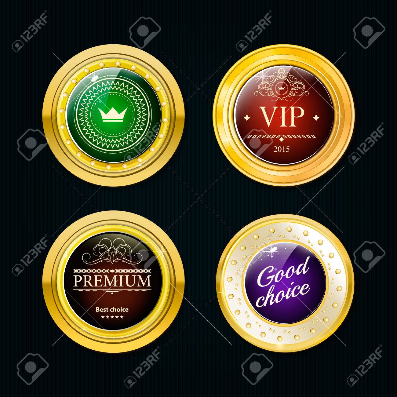 光沢とゴールド ラベル。金の設定の色の石。緑赤と青の石。黒の背景にテキストでベクトル ラベルのイラスト素材・ベクター Image 46425794。