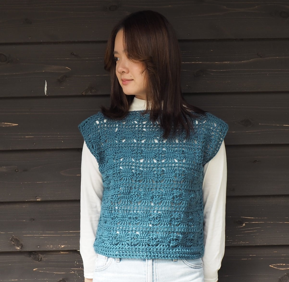 着画 手編み春夏服コーデ。かぎ針編みまっすぐベスト。mimosaのあみもの日記~埼玉県 所沢市 の編み物教室~。